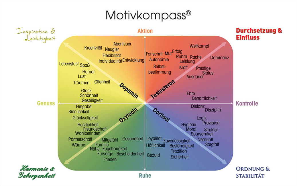 Der Motivkompass nach Dirk Eilert ist ein kraftvolles Werkzeug, um die Grundantriebe des Menschen zu verstehen und sie in Balance zu bringen. Basierend auf neurobiologischen Erkenntnissen unterscheidet er vier zentrale Grundmotive, die auf zwei Achsen angeordnet sind: